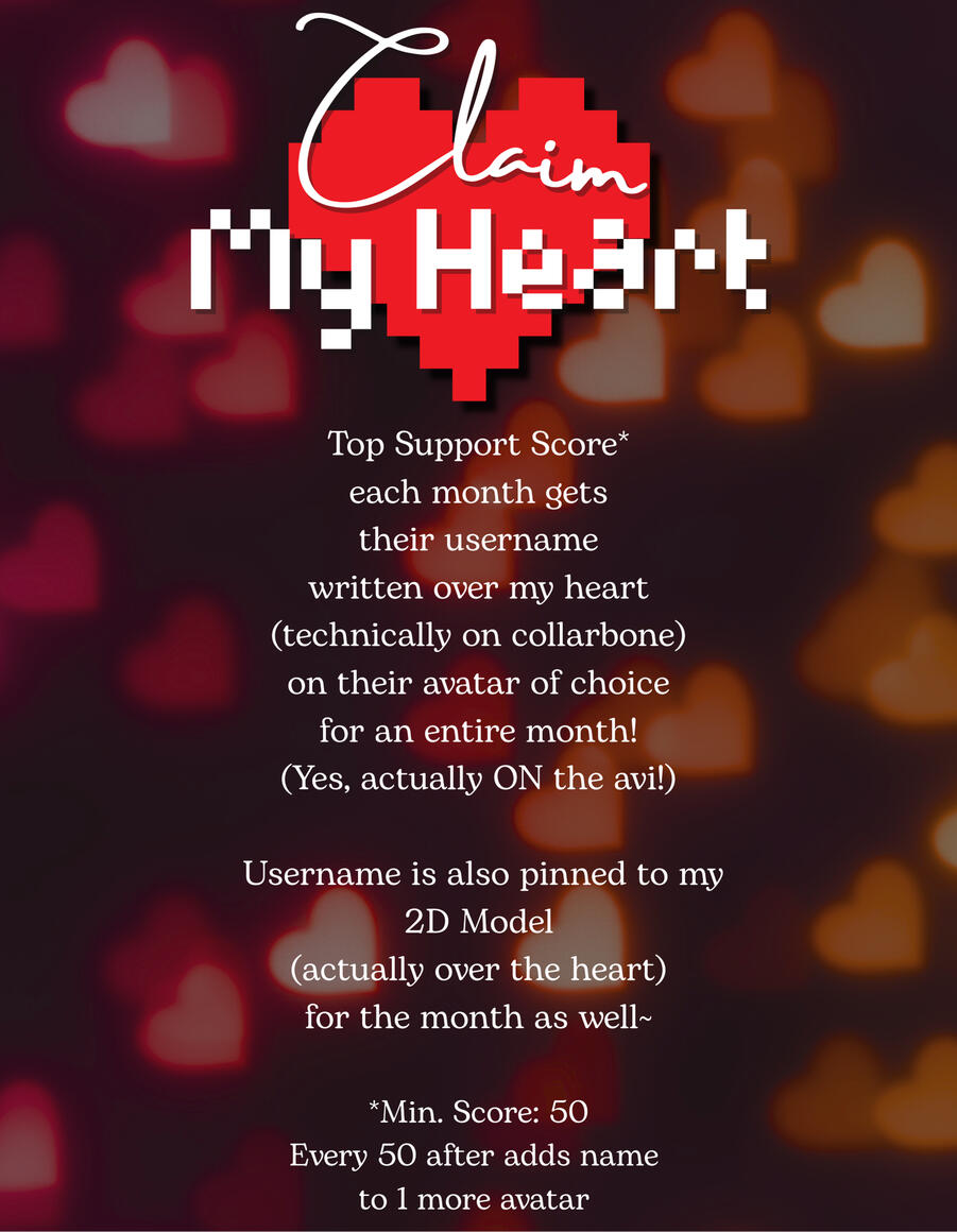 | Claim My Heart | Top Support Score* at the end of the month gets their username over the heart (technically on collarbone) of an avatar of their choice for 1 month. *Minimum Score Points: 50 - Every 50 after adds username to 1 additional avatar - Username also gets pinned over the heart of my Live2D Model during the same timeframe. | Until Further Notice | N/A |